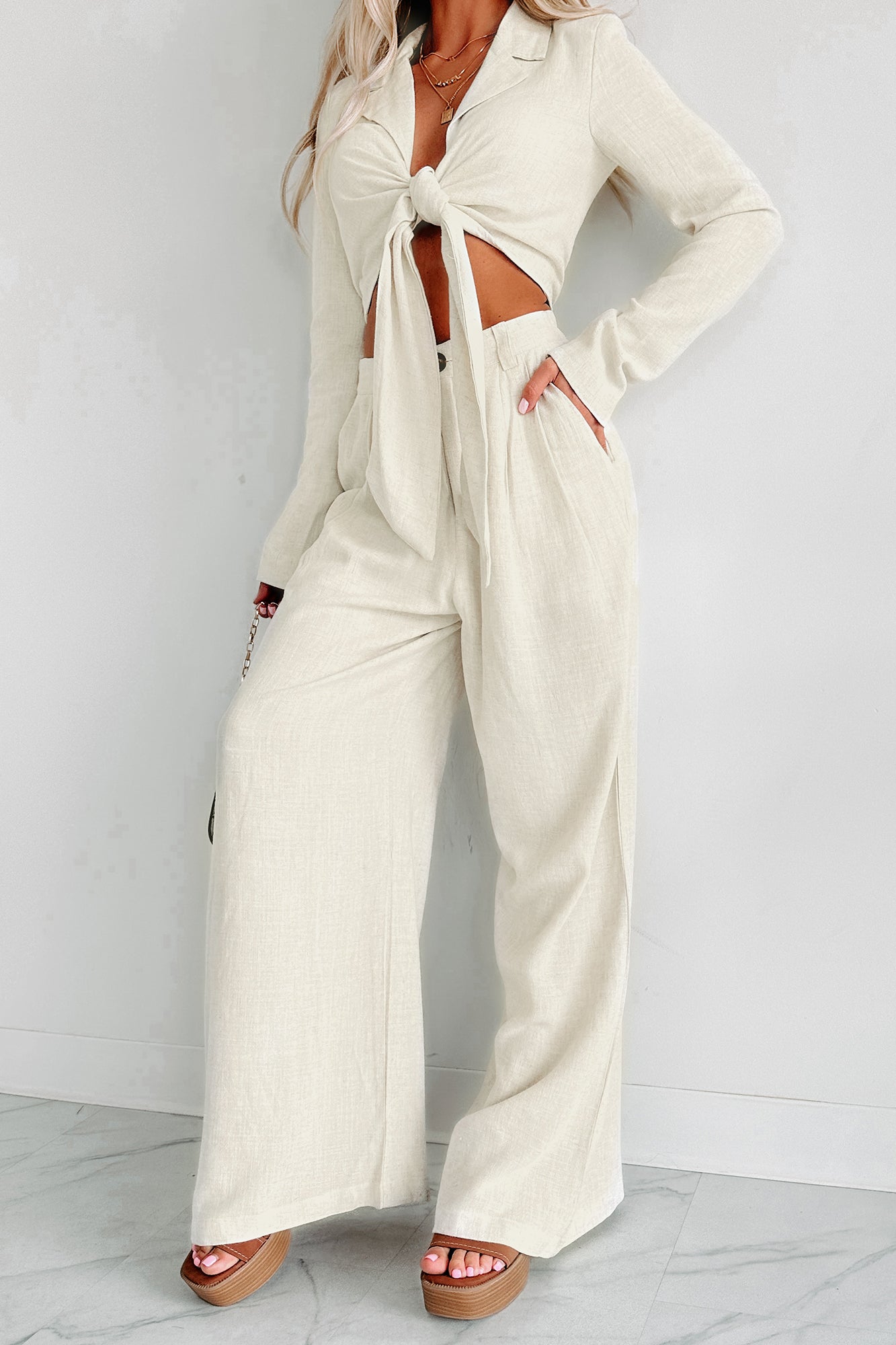 - Top: Collared, Deep V-Neck, Tie Front, Long Sleeve, Padded Shoulders, Cropped Length